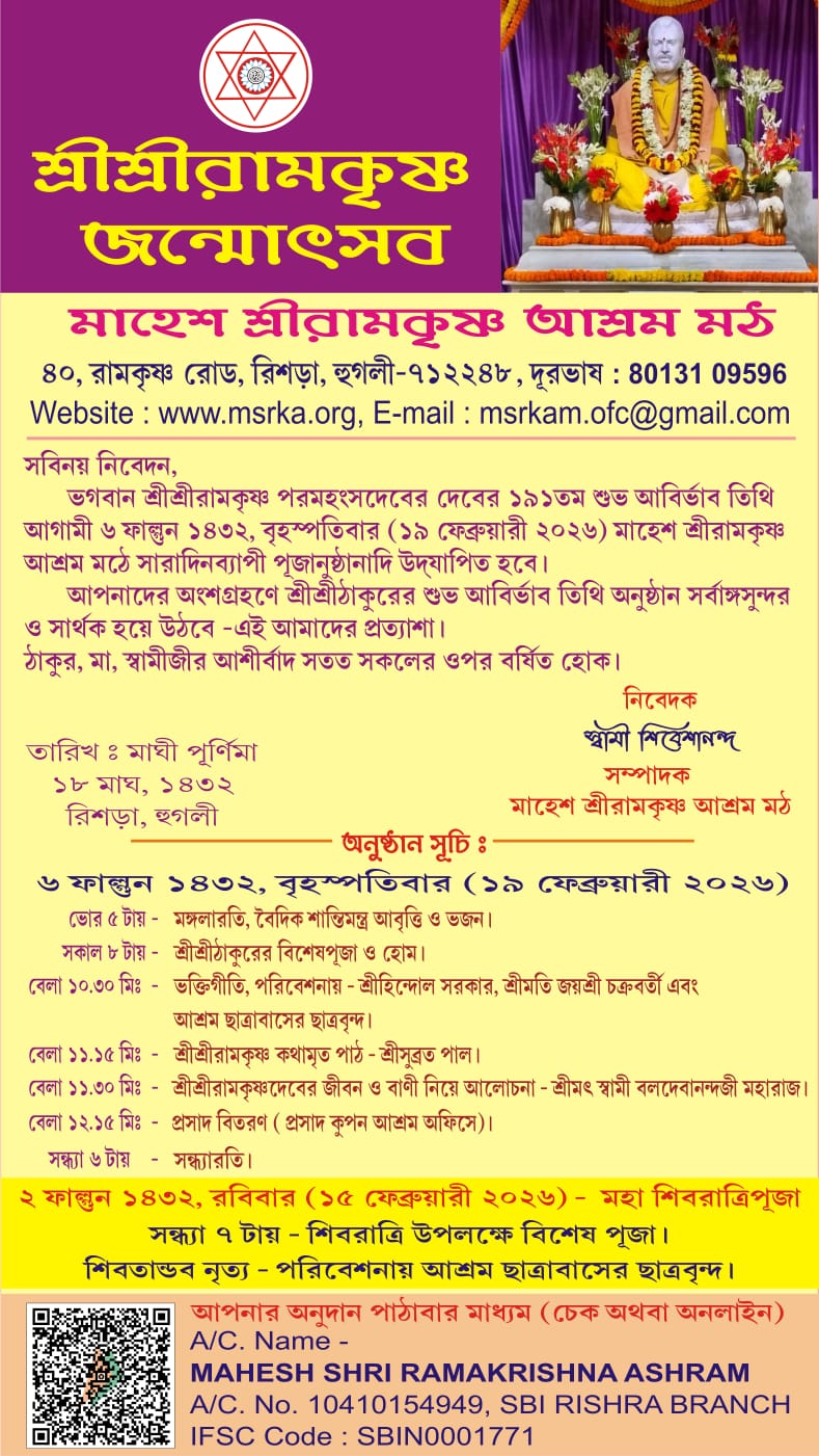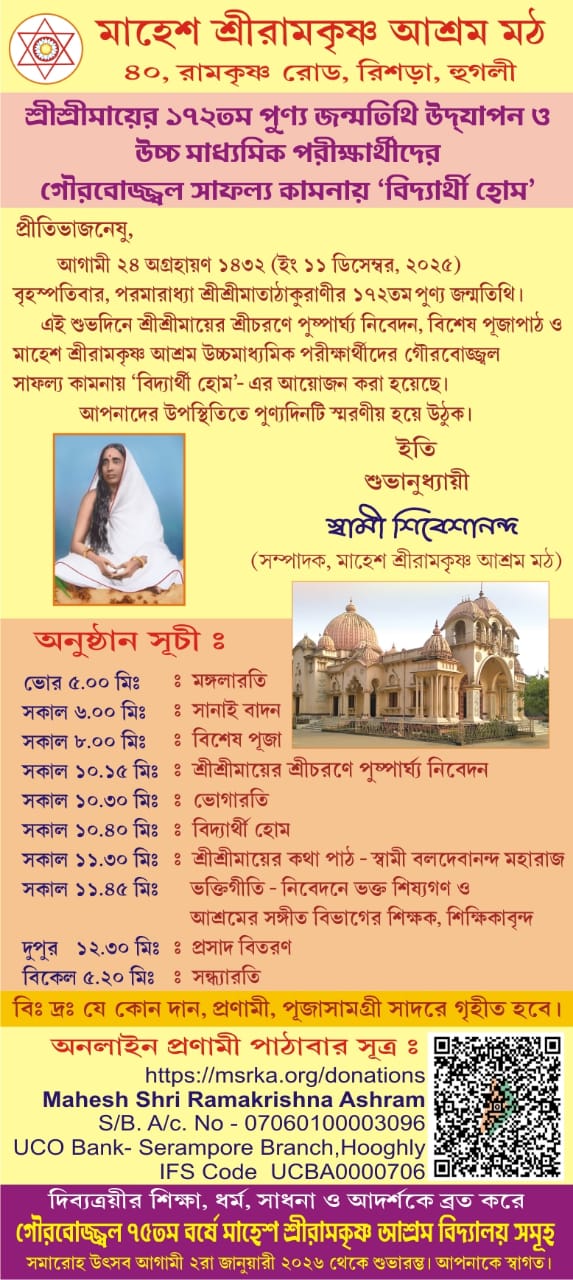 Mahesh Shri Ramakrishna Ashram Math, established on 2nd January, 1952 by Swami Premghanananda Maharaj, flourished gradually in the heart of Rishra with all its rich cultural, spiritual, and Ashramik ideologies. Swami Premghanananda was the direct disciple of Swami Shivananda Maharaj, the 2nd President of BelurRamakrishna Math and Mission. Swami Premghanananda undertook the courage to establish an institution only to fulfil his dream that every child of the locality should be privileged to have basic education. Initially the land was very small for the project but his mission was huge. Not only that, he also engaged himself in "Kishore Bangla", a periodical magazine for children where he tried to teach them the norms of an ideal life, the social and cultural heritage of the nation and so many motivational things, but all in very easy terms with full of literary essence. That was the beginning. From then on, this institution has gone through continuous progress and is now considered as one of the renowned academic institutions in Hooghly District as well as in West Bengal.